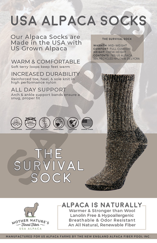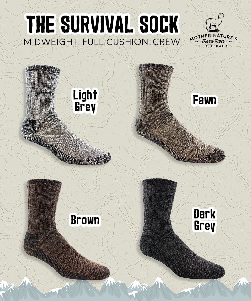 Our Survival Sock is a terry loop lined mid-weight sock designed for a wide range of outdoor activities and climates. The soft alpaca terry loops are combined with a durable nylon outer shell. Reinforced foot arch band and a ribbed knit ankle support ensure a proper fit every time. This warm and comfortable sock is our best selling style across the country! Hypo-allergenic, un-dyed, and odor resistant.